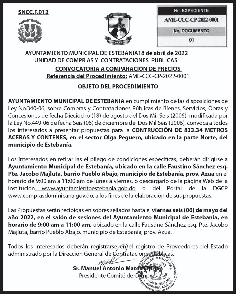 Estebanía, Azua- El AYUNTAMIENTO MUNICIPAL ESTEBANÍA en cumplimiento de las disposiciones de Ley No. 340-06 sobre Compras y Contrataciones Públicas de Bienes, Servicios, Obras y Concesiones de fecha Dieciocho (18) de Agosto del Dos Mil Seis (2006), modificada por la Ley No. 449-06 de fecha Seis (06) de Diciembre del Dos Mil Seis (2006), invita a todos los interesados a presentar propuestas para LA CONSTRUCCION DE ACERAS Y CONTENES EN EL SECTOR OLGA PEGUERO UBICADO EN LA ZONA NORTE DE ESTE MUNICIPIO DE ESTEBANÍA.